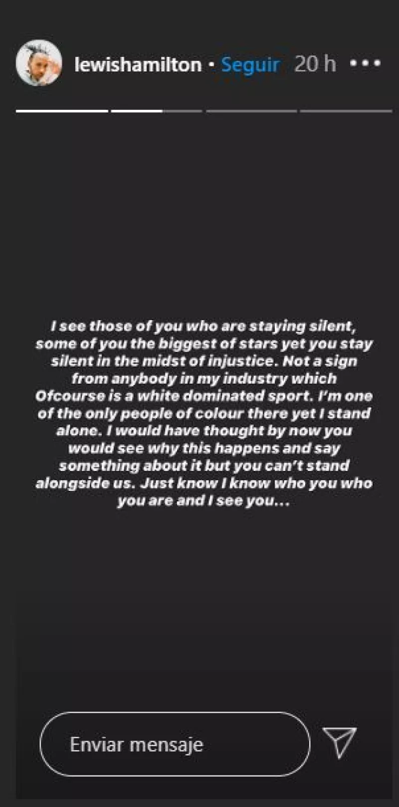 "Algunos de ustedes figuran entre las más grandes estrellas y sin embargo permanecen silenciosos frente a la injusticia", escribió el piloto de la escudería Mercedes en su cuenta Instagram.