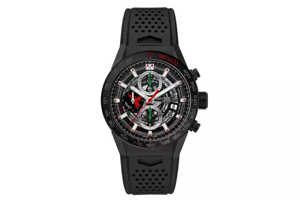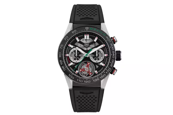 Fueron solo 20 piezas las que se crearon para celebrar el 55 aniversario de la colección Carrera. Está elaborado con una caja de 45 mm de titanio de grado 5, lo que le da ligereza y resistencia. Su bisel de cerámica negra porta orgullosamente la palabra “México” en color verde; el tourbillon —que detenta el certificado COSC—, es resguardado en una jaula de carburo de titanio a las 6 en punto.