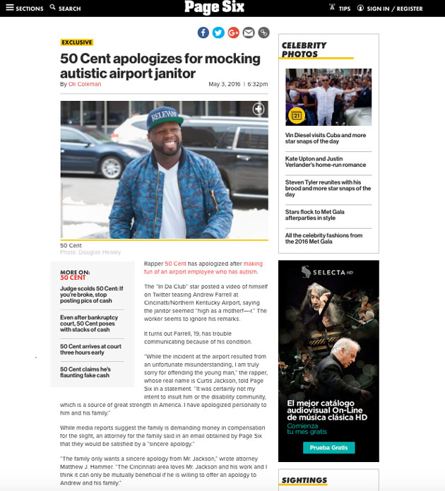 De igual manera, miles de personas criticaron la actitud de 50 Cent, quien hasta el momento se limitó a emitir un comunicado en el portal Page Six en el que explica que todo fue un "desafortunado malentendido".