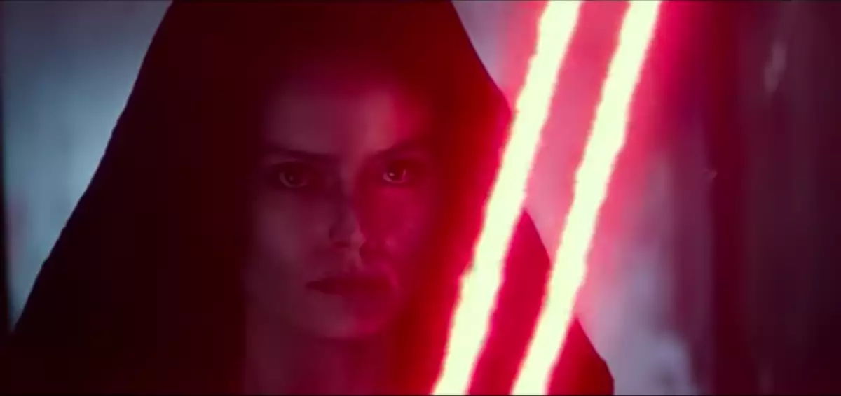 En este aparece Rey con una capa negra y el sable mencionado, atuendo con el que se suelen identificar a los sith en este universo creado por George Lucas.