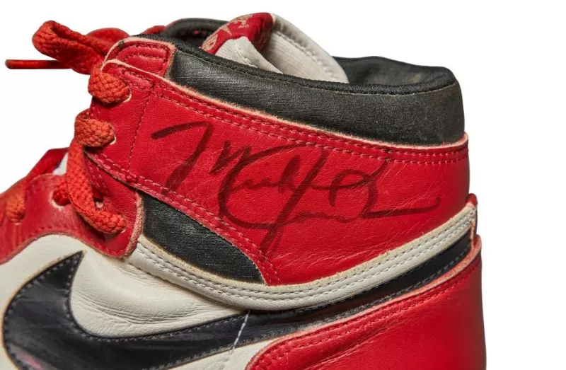 Los Air Jordan 1 blancos, negros y rojos que se subastarán, tienen cordones rojos, están firmadas por Jordan y evidencian el uso frecuente del exjugador de los Chicago Bulls.