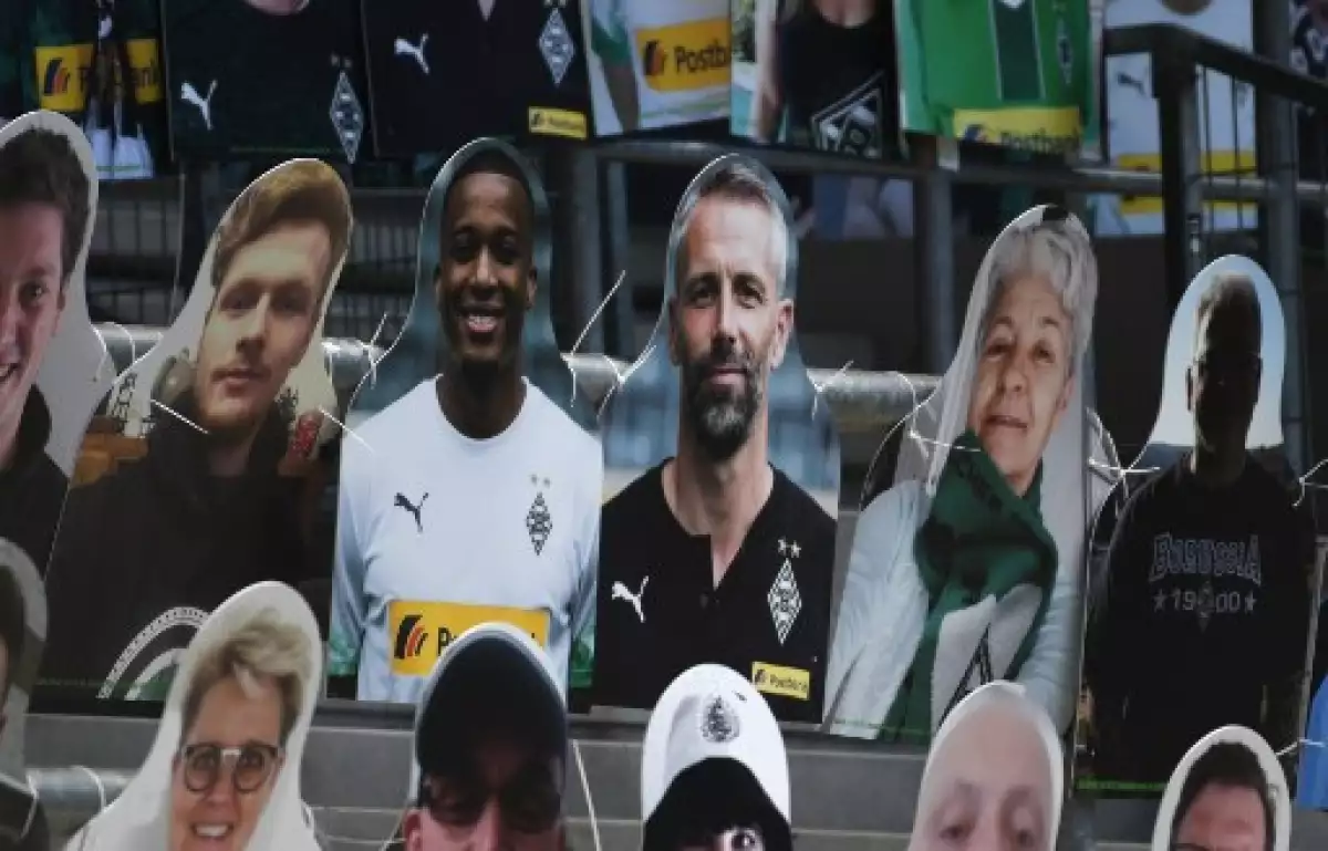 Cerca de 13,000 figuras de cartón simulando aficionados se instalaron en las gradas del estadio del Borussia Mönchengladbach, que este sábado recibirá a puerta cerrada al Bayer Leverkusen en la 27ª jornada de la Bundesliga.