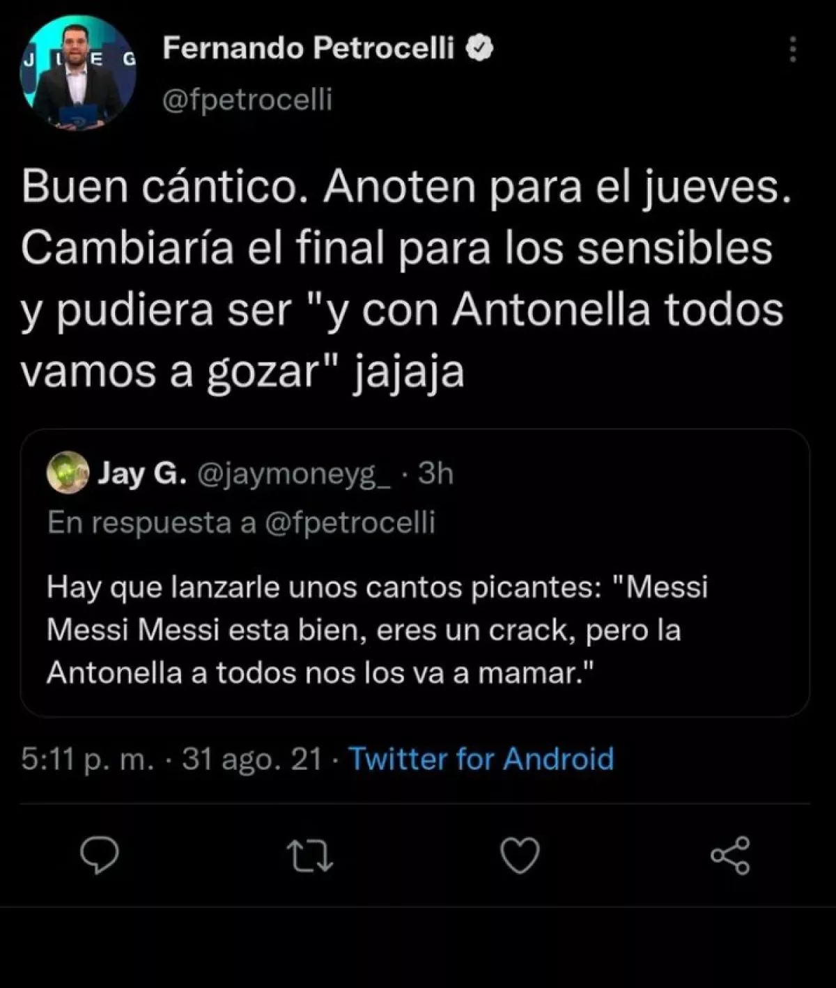 Fernando Petrocelli, presentador de Directv Sports, hizo un comentario por Twitter ofensivo a la esposa de Lionel Messi.