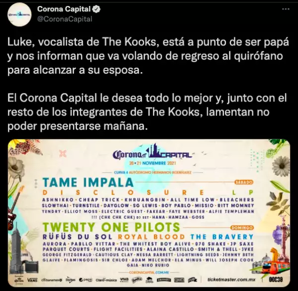 Por medio de la cuenta oficial del festival se dio a conocer que la banda se ausentará, ya que el músico de volverá a Reino Unido para encontrarse con su mujer en el quirófano y recibir a su primer hijo. Un hecho que conmovió a sus fans, además de mostrar el amor que le tiene a su esposa Ellie.