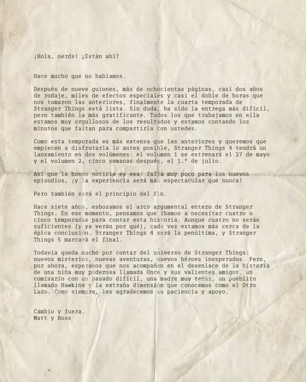 "Cada vez estamos más cerca de la épica conclusión. Stranger Things 4 será la penúltima, y Stranger Things 5 marcará el final", reza la carta.