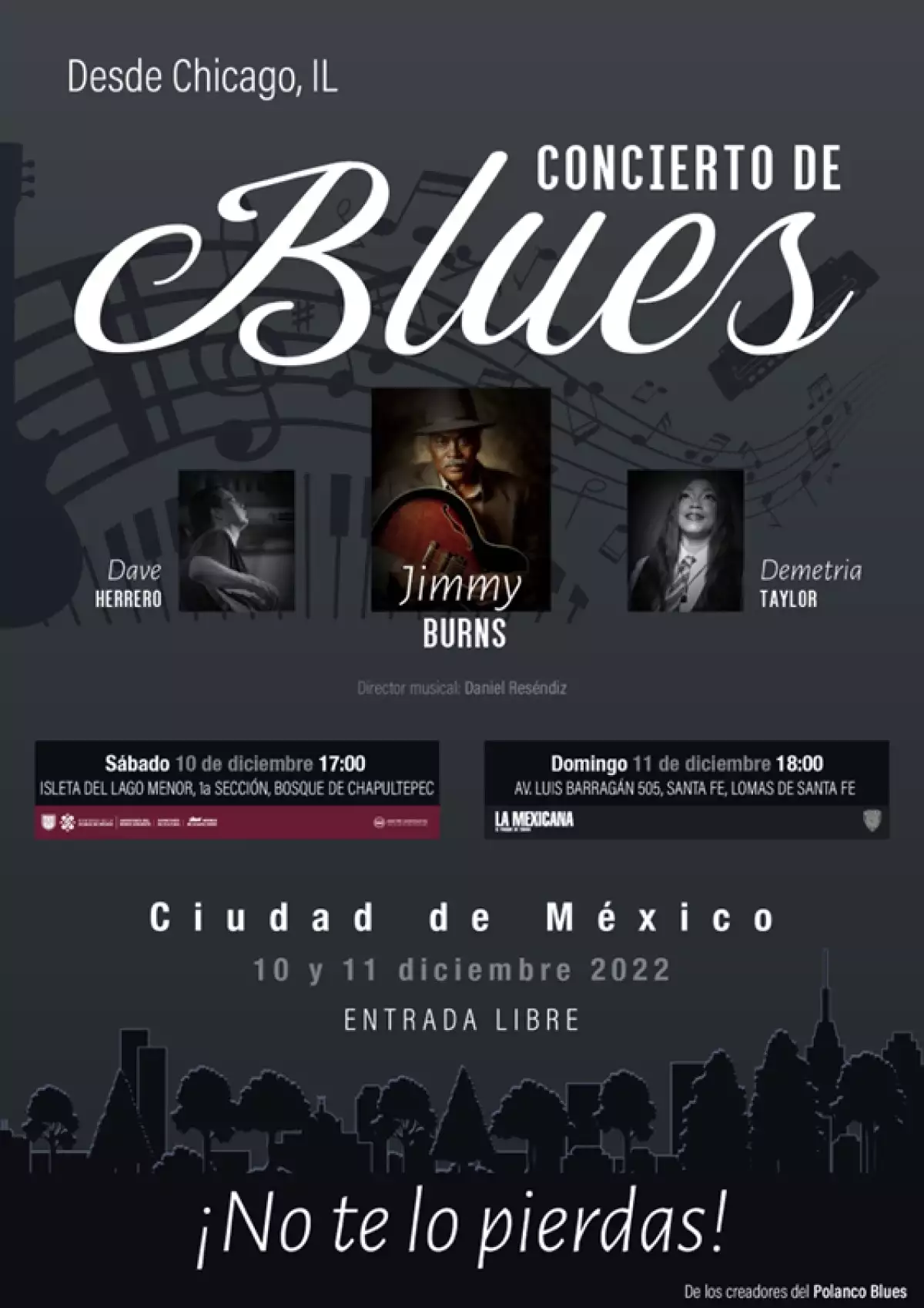 Este festival que muestra a algunos de sus representantes más notables se llevará a cabo el sábado 10 de diciembre, quienes darán inicio a las 17:00 horas, en la Isleta del Lago Menor, 1ª Sección del Bosque de Chapultepec. Para el domingo 11 de diciembre, el encuentro será a las 18:00 horas en el anfiteatro del parque La Mexicana en el área de Santa Fe.