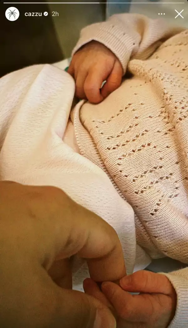 Fue a través de una nueva fotografía en sus historias de Instagram, donde se ve una mano sostener las manos de su bebé, que viste un suéter de color rosa aparentemente de la marca Dior y tapada con una manta.