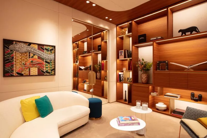En la boutique, también se rinde homenaje a María Félix, una de las clientes más destacadas de la marca y quien fuera uno de sus vínculos más fuertes con el país. Justamente uno de los salones privados para clientes VIP lleva su nombre y toma como fuente de inspiración su arrolladora personalidad para la decoración. Imágenes de las impactantes piezas creadas para ella con forma de reptiles –cocodrilos y serpientes– y un retrato de ella realizado por el artista Jean-Philippe Delhomme resguardan el espacio.