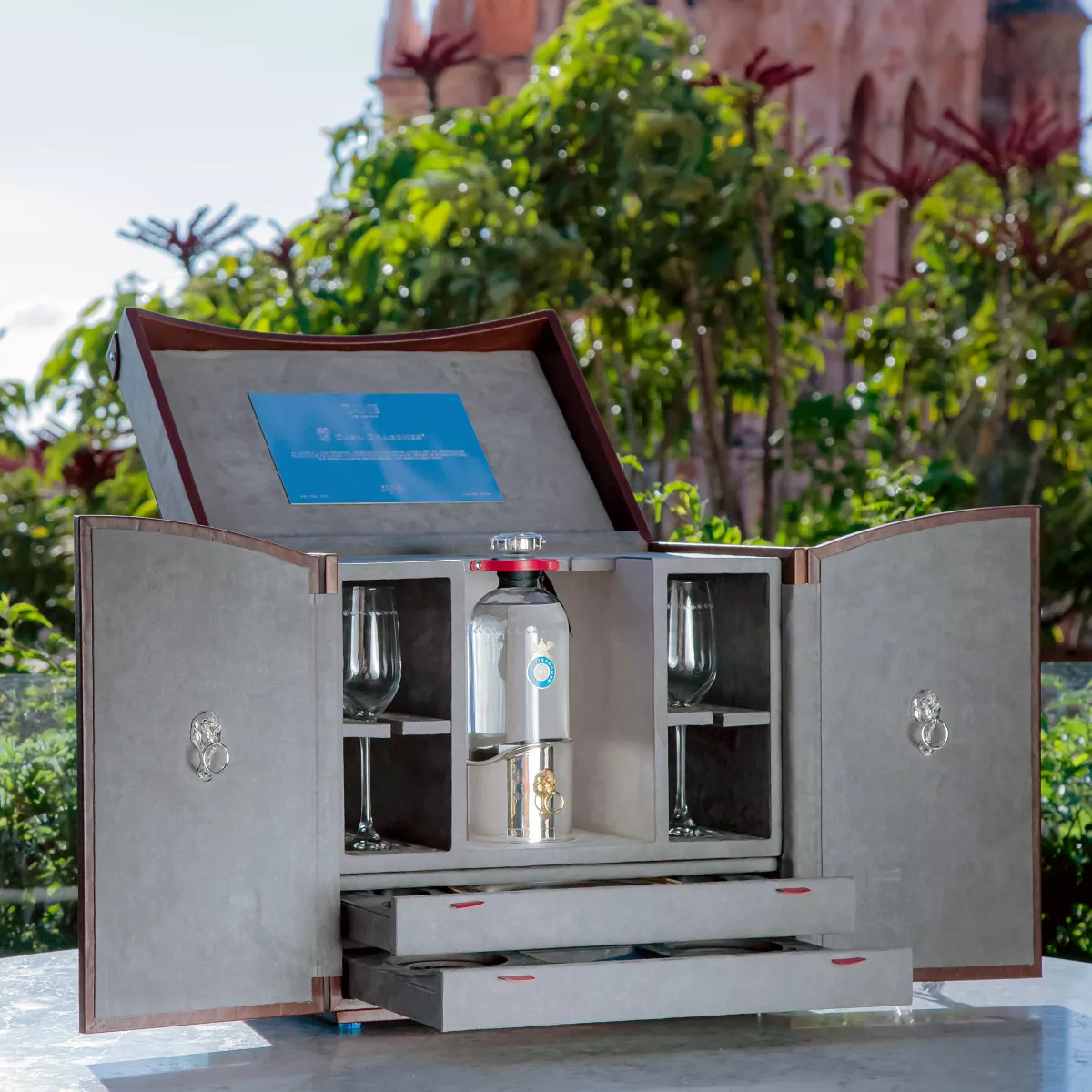 En esta edición especial, TANE diseña un baúl conmemorativo para reunir lo mejor de ambas casas: la plata y el tequila. Contiene un cubre-tapón y base para botella en plata .925 con detalles de vermeil en Oro Amarillo de 23 quilates, una charola en plata .925, además de cuatro portavasos de madera Nogal Americano y plata .925, cuatro identificadores de copa hechos en plata .925 con detalles de vermeil en Oro Amarillo de 23 quilates alusivos a La Casa Dragones, cuatro copas Riedel Overture tequileras y 1 botella de Tequila Casa Dragones Joven (750 ml). Para hacer esta edición y la experiencia aún más especial, este año el set TANE x Casa Dragones viene con seis botellas adicionales de Casa Dragones Joven (6 x 750ml).