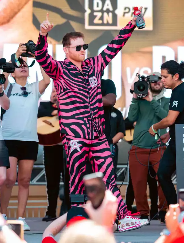 El mexicano campeón mundial de cuatro divisiones y primer boxeador en la historia en convertirse en campeón indiscutido en el peso súper mediano, vestía una pijama de seda de manga larga personalizada con estampado animal de cebra rosa.