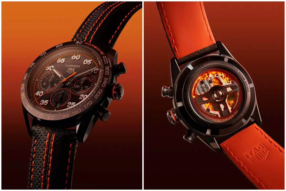 Tag Heuer y Porsche unieron sus fuerzas nuevamente para lanzar un reloj audaz y deportivo, el Tag Heuer Carrera x Porsche Orange Racing. Es un modelo que muestra la pasión por las carreras compartida por ambas marcas y mantiene la calidad y el rendimiento que ofrece el sistema interno Calibre Heuer 02, lo que ofrece una impresionante reserva de marcha de 80 horas. En todo el reloj se puede encontrar el color naranja vibrante, inspirado en el color de las chispas de calor hechas por el coche en el asfalto.