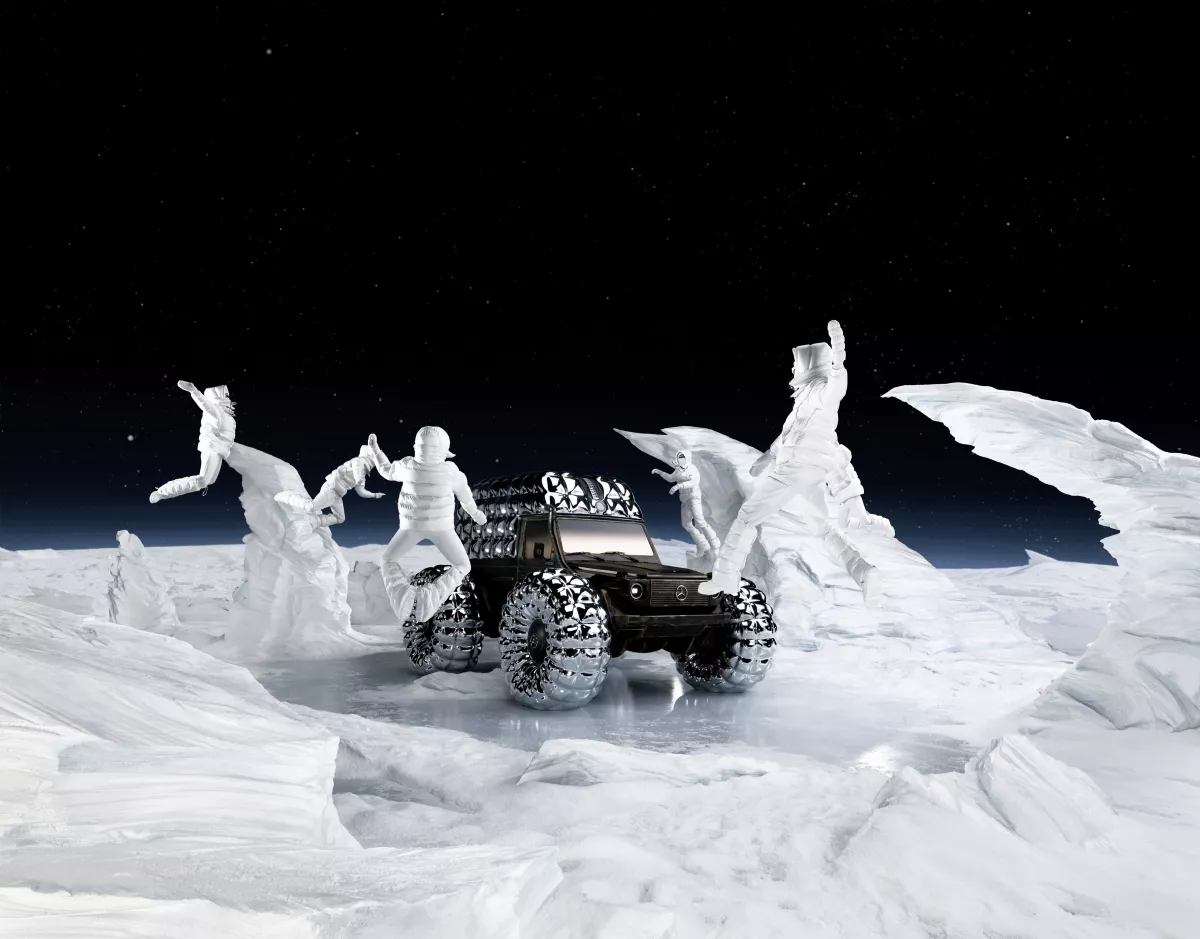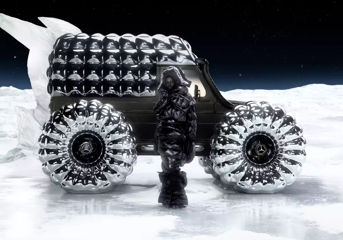 Esta pieza de arte diseñada fue exclusivamente para la colaboración de Mercedes-Benz y Moncler mezcla los rasgos característicos del icónico todoterreno Clase G de Mercedes-Benz con el abrigo acolchado de Moncler que define el estilo.