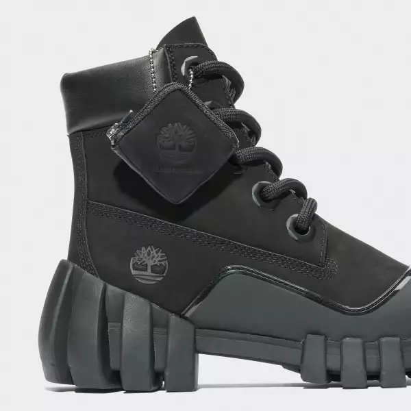 FUTURE 73 ha reunido a seis de los principales fabricantes de todo el mundo con el objetivo de repensar el icónico calzado de Timberland, en conmemoración de su 50º aniversario. Humberto León, un diseñador y director creativo versátil, con experiencia en el ámbito minorista y la restauración, lideró esta colección con la intención de reinventar la bota tradicional de 6 pulgadas de Timberland, enfocándose en la protección al aire libre sin sacrificar la precisión y comodidad. El resultado es una bota de color negro con una suela de goma llamativa y un diseño audaz y único. Las suelas han sido fabricadas utilizando caucho reciclado para garantizar una mayor durabilidad. La etiqueta colgante incorpora ambas marcas y, además, cumple una función adicional al servir como una pequeña bolsa.