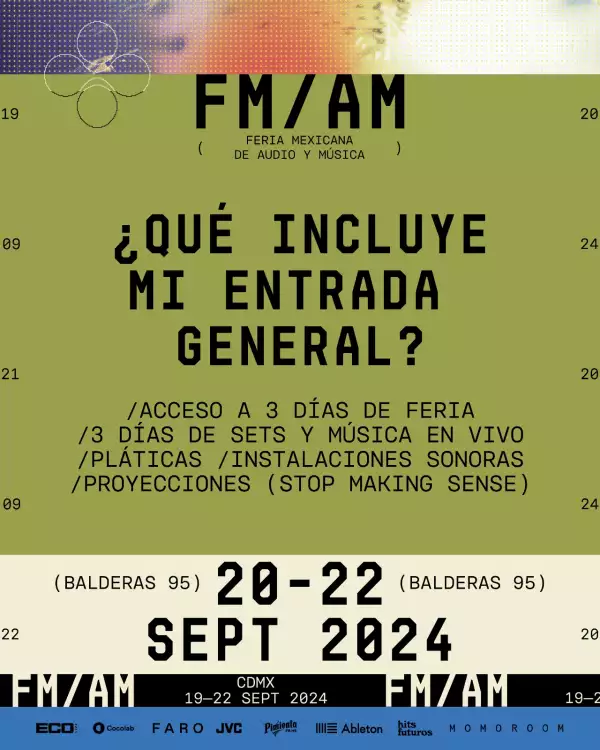 FM/AM ya tiene más nombres y con tu entrada general, podrás accesar los tres días de feria y tener permanencia voluntaria a todas las actividades (excepto talleres) desde las 11:00 AM hasta el cierre: pláticas, instalaciones sonoras, bazar, DJ sets y la proyección de Stop Making Sense de Talking Heads presentada por Pimienta Films.