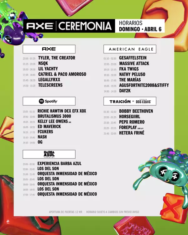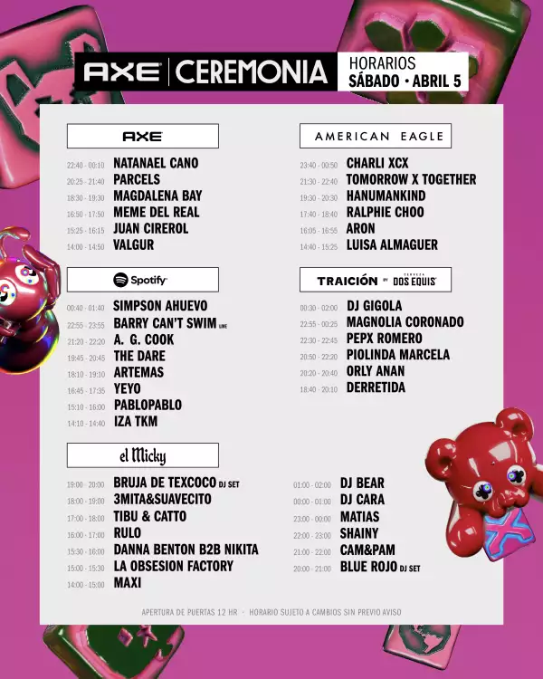 La temporada de festivales ya está en marcha y el Parque Bicentenario se prepara para recibir a Charli XCX, TXT, Massive Attack y otros grandes talentos en el Axe Ceremonia 2025. Este 5 y 6 de abril, el festival reunirá a algunas de las propuestas más innovadoras de la escena global en la Ciudad de México. Para que no te pierdas a tus artistas favoritos, aquí están los horarios oficiales por día y escenario.