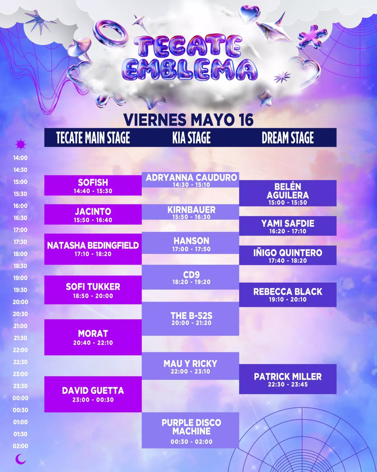 Aquí te dejamos los horarios por día para que armes tu plan y no te pierdas a tus artistas favoritos.
