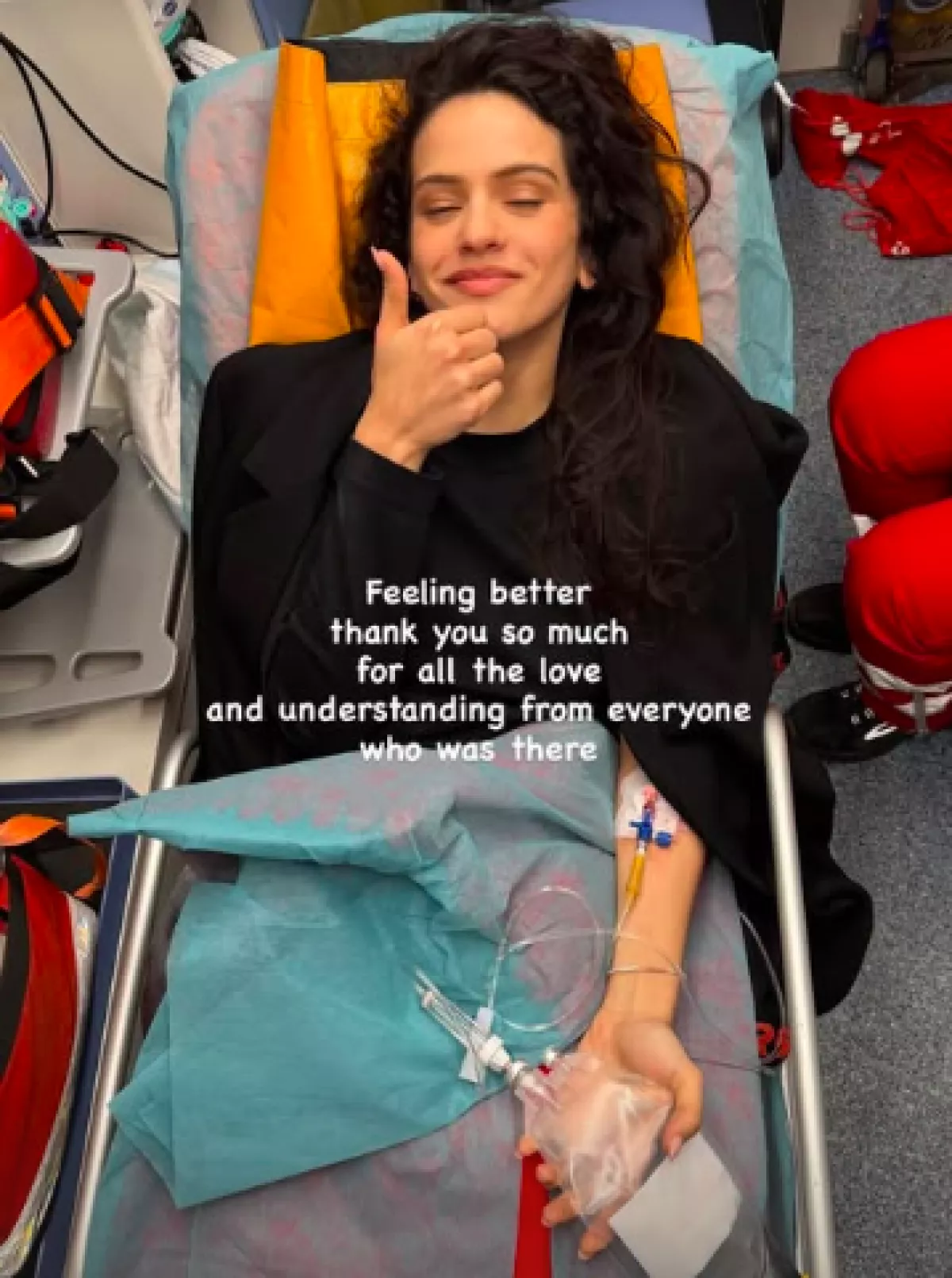 Posteriormente, este jueves la artista reapareció a través de una historia de Instagram en donde se ve que se encuentra en un centro hospitalario o unidad sanitaria móvil, posada en una camilla con una vía intravenosa.