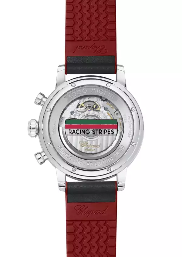 Mille Miglia Racing Stripes Mexico Edition está equipado con un motor relojero de alta precisión, certificado cronómetro por el Control Oficial Suizo de Cronometría (COSC), que late a la frecuencia de 28'800 alternancias/hora, visible a través del fondo de zafiro de la caja adornada con el logo 1000 Miglia.