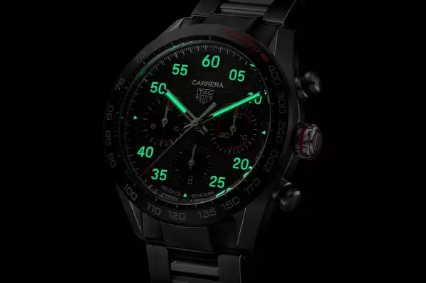 El bisel cuenta con la inscripción Porsche grabada con la misma tipografía utilizada en los índices. El reloj incorpora en todos sus elementos los colores rojo, negro y gris –evocando también los modelos Heuer históricos–, mientras que, en el fondo de la caja, el cristal transparente permite contemplar la masa oscilante, en este caso rediseñada en homenaje al volante Porsche y que lleva impresas las inscripciones Porsche y TAG Heuer. La esfera muestra un efecto asfalto, creado especialmente para este modelo, que refleja la pasión por la carretera, y los dígitos arábigos nos recuerdan los del cuadro de mandos de estupendos deportivos Porsche.