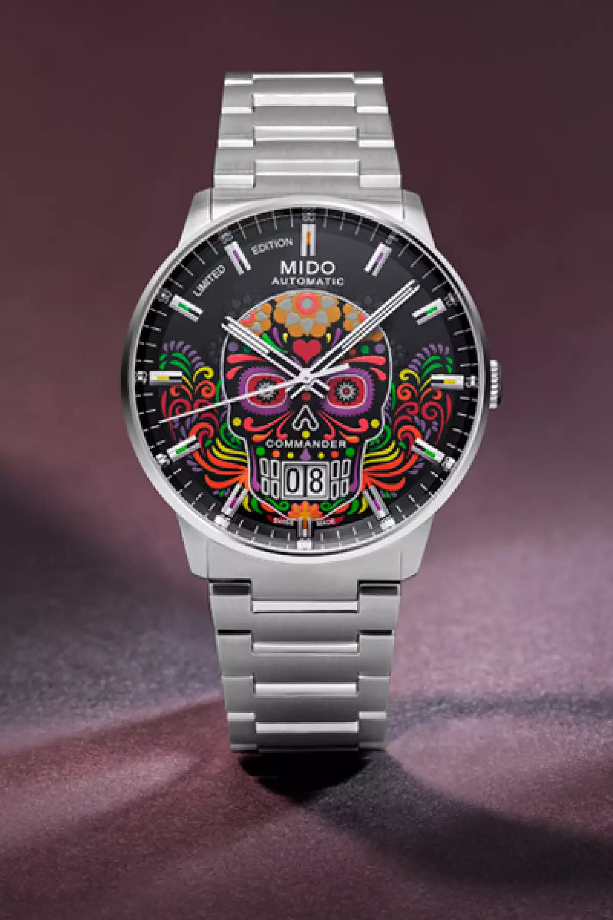 MIDO busca enfatizar las tradiciones mexicanas y compartirlas con el mundo a través de su Commander Big Date Celebración Edición Limitada, un reloj con explosión de color reflejada en la figura de una calavera que envuelve toda la carátula con lienzos desplegados alrededor. La calavera fue especialmente imaginada para demostrar las tradiciones mexicanas, impresa con 12 colores distintos de Super-LumiNova crea una cara diferente de día y de noche.