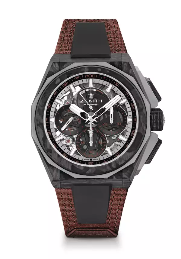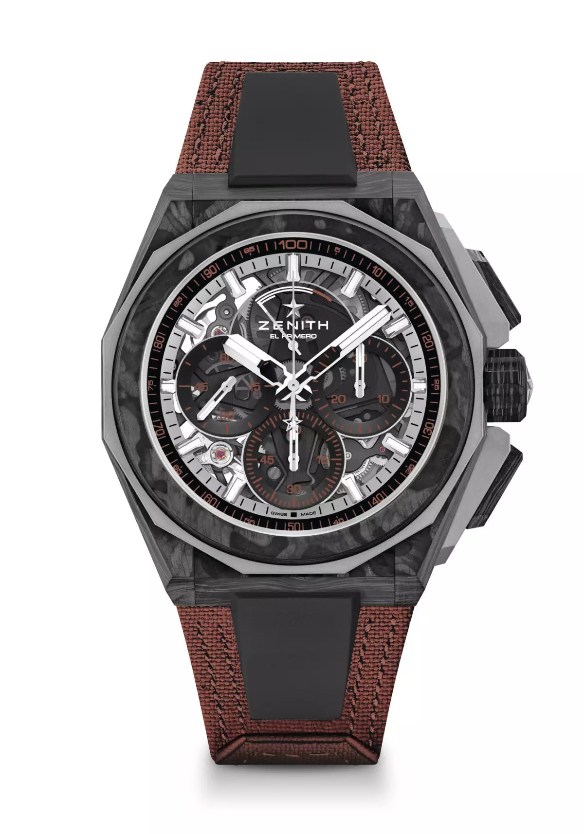 Está elaborado en fibra de carbono ligera y muy duradera a la vez, también para la corona y los pulsadores del cronógrafo. Los protectores de los pulsadores, que enfatizan su geometría angular de la caja, así como el bisel de doce caras, son de titanio microchapado. La esfera abierta de varias capas presenta elementos de cristal de zafiro tintado, adornados con remates en marrón cobrizo que evocan el terreno seco y rocoso y las minas de cobre chilenas.