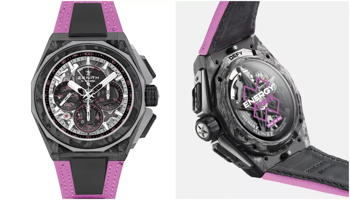 Por ello, Zenith se inspiró en esto y presentó el DEFY Extreme E “Energy X Prix”, una edición limitada de 20 relojes que combina fibra de carbono y titanio con sorprendentes detalles morados que representan los relámpagos que iluminan el cielo durante una tormenta.