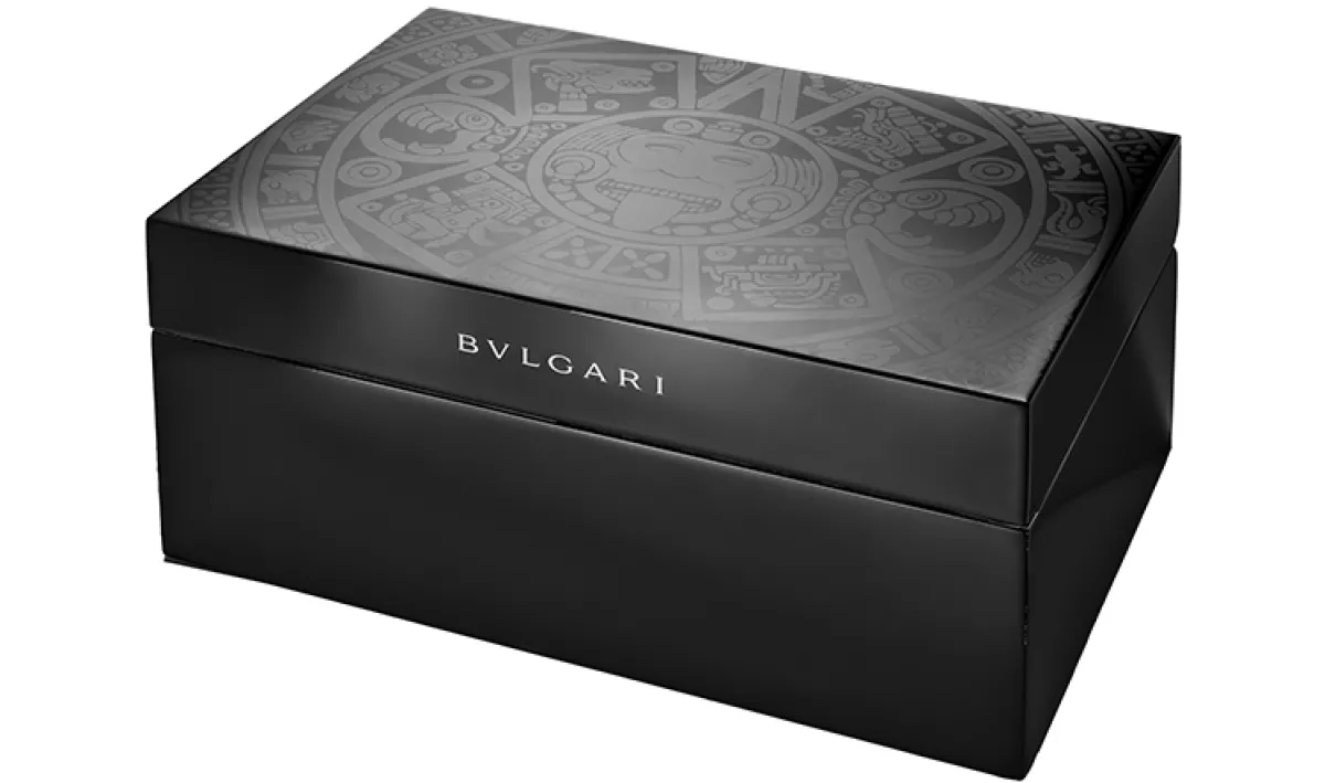 El verde de sus índices es malaquita que contrasta con sus manecillas caladas en rojo. Pero el espectáculo estético se extiende también a la parte trasera del reloj: cada una de las piezas está decorada con el Calendario Azteca, sumamente detallado y preciso gracias al terminado metalizado.