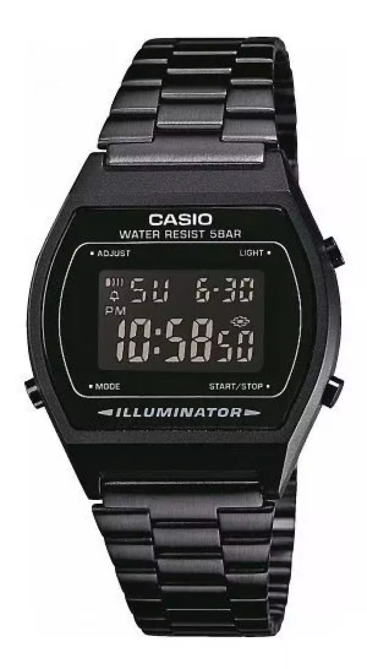 Modelo Vintage B640wb-1bv. Hermosa y versatil pieza de color negro que combina con todo. Tiene una pantalla LED, es de hebilla ajustable, correa de acero inoxidable y en especial, tiene una resistencia al agua por si alguien le derrama algo y dice “perdón que te sal-piqué”.
