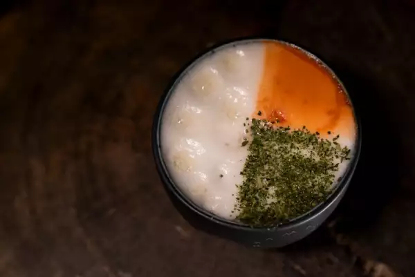 Inspirado en la cultura teotihuacana, Atl es un trago al que su creador, David Paz –hasta hace poco, bartender de Xaman– denomina coctelería simétrica. Su encanto radica en que, según el lado del que se tome, el sabor cambia radicalmente, gracias a su garnitura seccionada de Stevia, Peychaud y aceite de ajonjolí. El cuerpo del coctel está compuesto por agua de garbanzo, vinagre de frambuesa, giffard de plátano, whisky , clara de huevo y kombucha, y es una muestra ejemplar de cómo pueden mezclarse tres tendencias muy frescas en la mixología: los vinagres, los fermentados y el aquafaba.