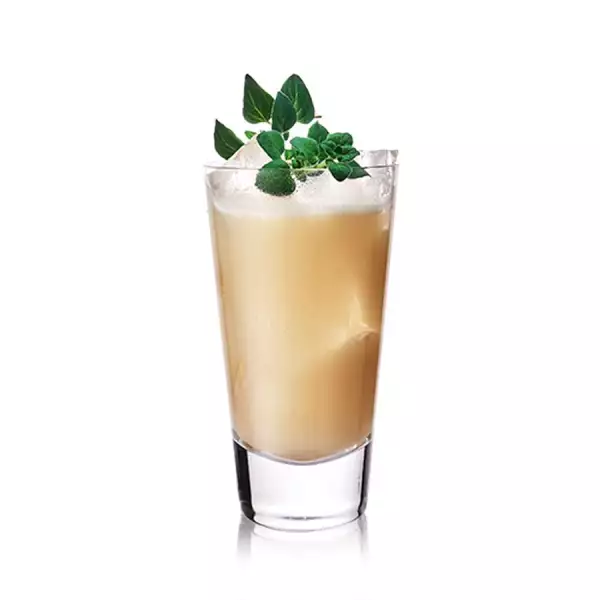 Pon todos los ingredientes en un shaker y cuela. Sirve en un vaso para highball con hielo en bloque. Decora con una hoja de toronjil.