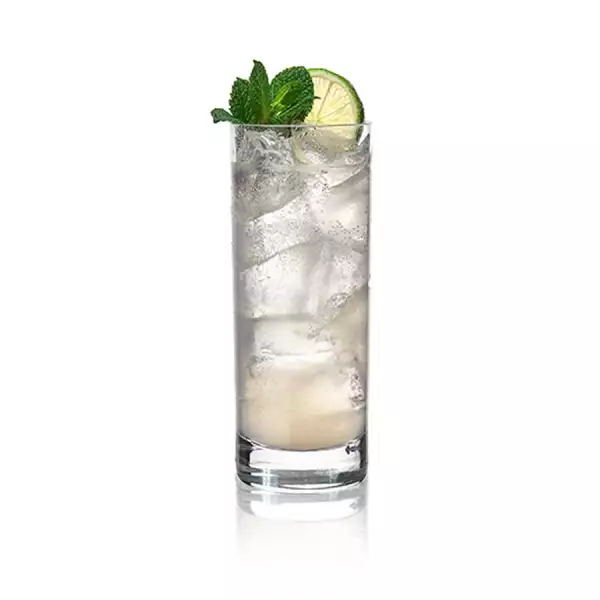 Sirve todos los ingredientes en un vaso con hielo picado. Decora con el limón y la menta.