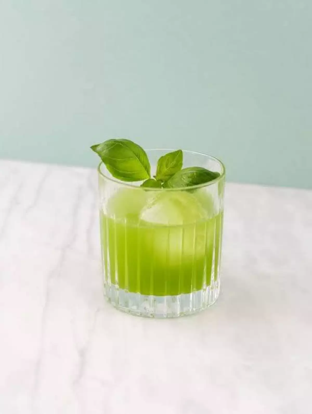 Método: Macerar la albahaca con el resto de los ingredientes en un shaker, agregar hielo y agitar vigorosamente. Servir en un vaso con hielo y decorar con una ramita de albahaca.