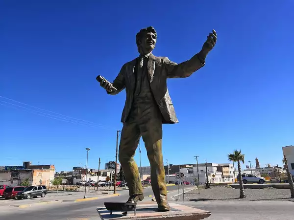 Tras su fallecimiento se creó una plaza pública con el nombre del cantautor y ahí se colocó una estatua con él como atractivo principal de este espacio en el primer cuadro de la metrópoli fronteriza a una cuadra de la Avenida Juárez. Ahí la pieza luce como Juan Gabriel a principios de los 90