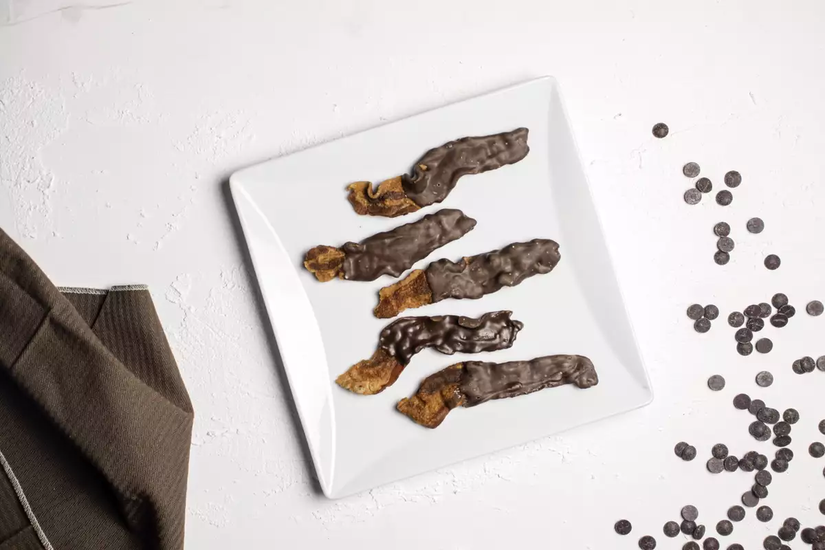 - Sumergir con cuidado cada rebanada de tocino hasta cubrir ¾ partes y colocar en papel encerado hasta que se solidifique el chocolate.