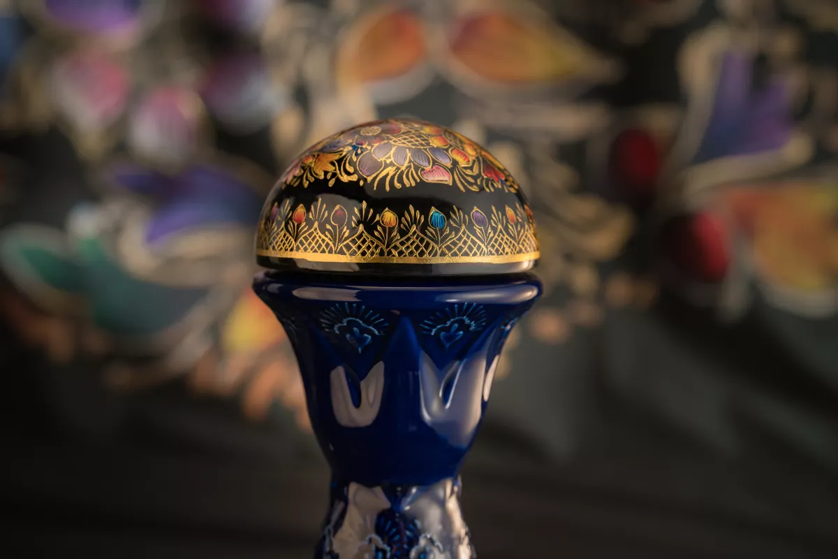 La segunda licorera está revestida con un esmalte azul profundo que evoca el cielo nocturno. Su tapón está decorado con la técnica del maque, un método tradicional de laqueado originario de la comunidad lacustre de Pátzcuaro, Michoacán.