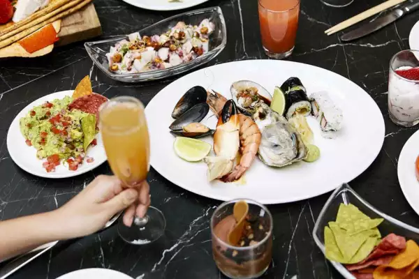 Tiene disponible para los comensales un buffet gourmet. Mimosas, quesos, ensaladas, sushi, platos fuertes y hasta ceviches a través de su buffet gourmet. ¡Perfecto para ir con tu persona favorita!