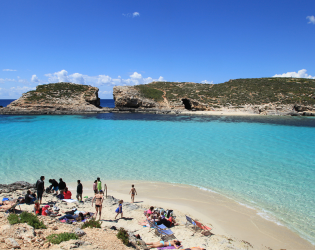 Un pequeño paraíso a la mitad de Malta, entre las islas de Comino y Cominotto. El agua es muy transparente, el azul turquesa resalta y contrasta con la arena blanca de la playa. En la Cueva de Santa María los amantes del buceo tendrán inmejorables vistas.
