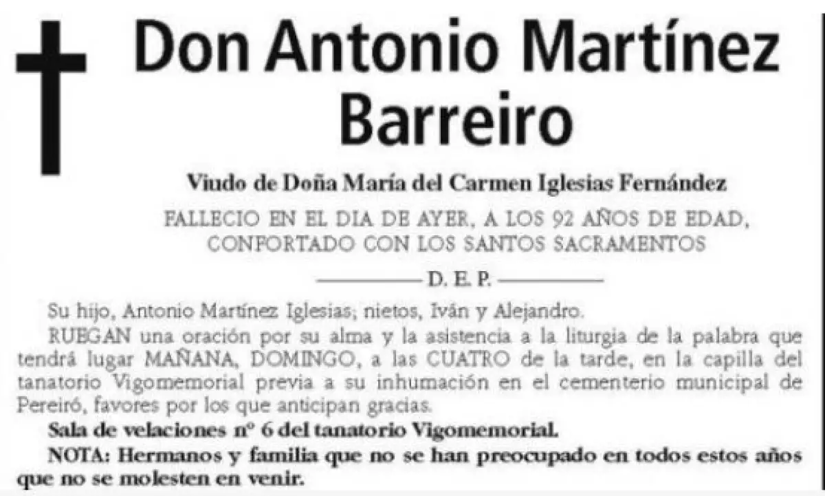 La localidad gallega de Vigo es sede de El Faro de Vigo , este rotativo ha publicado la esquela que dio a conocer el fallecimiento del señor Antonio Martínez Barreiro de 92 años. El texto informa que su hijo y sus nietos piden una oración por él, además de dar datos de la capilla ardiente y su posterior inhumación.