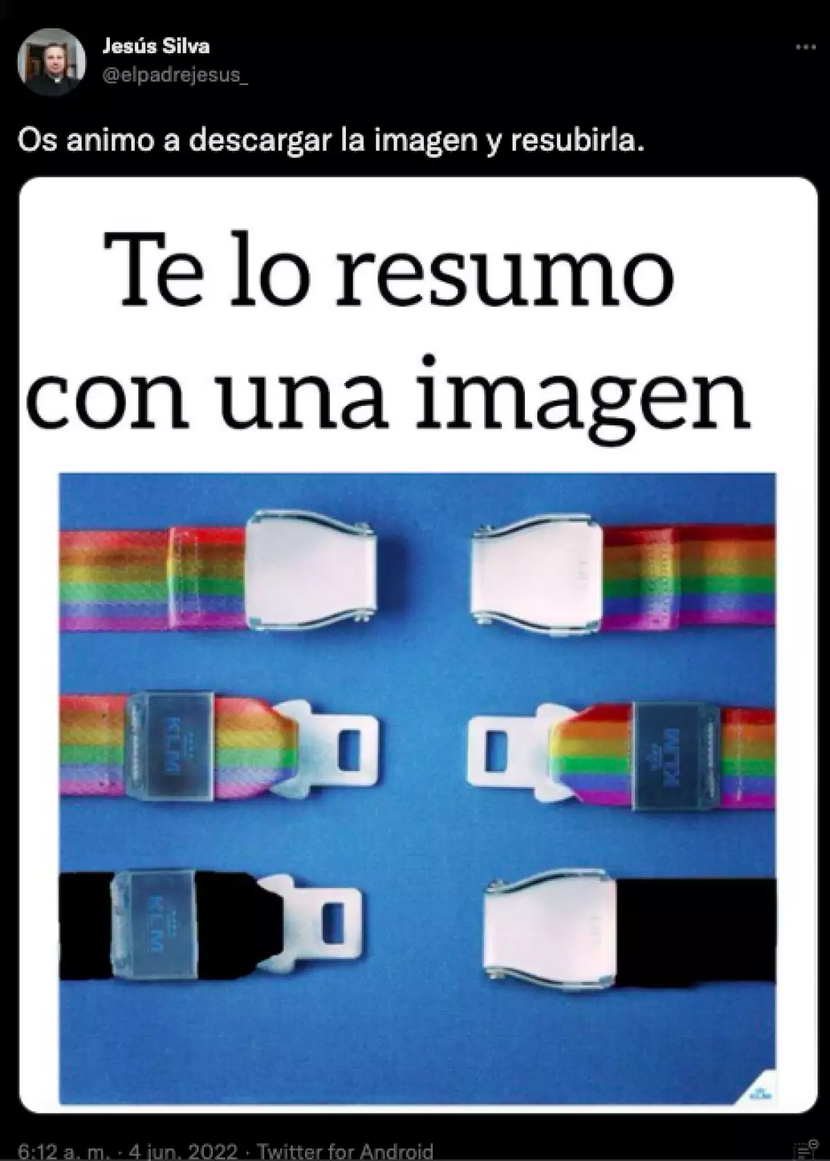 Uno de ellos es Jesús Silva (@ElPadreJesus_) quien compartió una imagen promocional de la aerolínea neerlandesa KLM en la que representa la diversidad con cinturones de seguridad en un avión, pero el católico decidió usarla para demostrar que la unión natural solo puede ser entre hombre y mujer y que en los otros dos escenarios, en los que además aparece el cinturón con la bandera LGBT+, es imposible. “Os animo a descargar la imagen y resubirla”, mencionó.