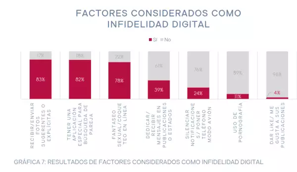 La infidelidad digital involucra vínculos afectivos o sexuales generados a través de medios que no requieren la presencia física. El estudio identifica las acciones más señaladas como infidelidad digital, que incluyen recibir/enviar fotos sugerentes o explícitas (83%), tener aplicaciones para buscar pareja (82%), y el coqueteo en línea o fantasías sexuales (78%). Otros actos mencionados incluyen mensajes en publicaciones o estados (39%), silenciar notificaciones o poner el teléfono en modo avión (24%), uso de pornografía (11%), y dar "me gusta" a otras publicaciones (4%).