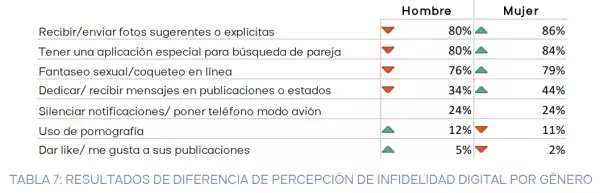 El estudio revela que las mujeres consideran como "infidelidad explícita" las acciones digitales con un contexto erótico o de posible pareja, como fotos, aplicaciones y mensajes coquetos. Los hombres, por otro lado, tienden a ver ciertas acciones como "infidelidad ambigua", como el consumo de pornografía y dar "me gusta" a publicaciones de otras personas. Estas percepciones varían según las creencias, actitudes y experiencias personales.